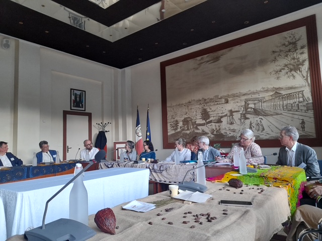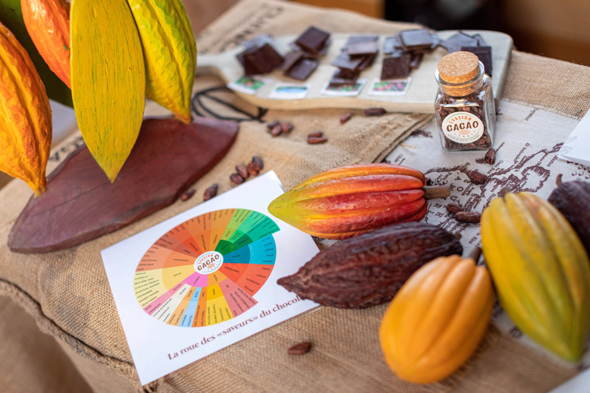 Anne Fortin, créatrice et animatrice des ateliers de dégustation Evasion Cacao, a métamorphosé la salle du conseil de la Mairie du Pecq pour une véritable immersion.
